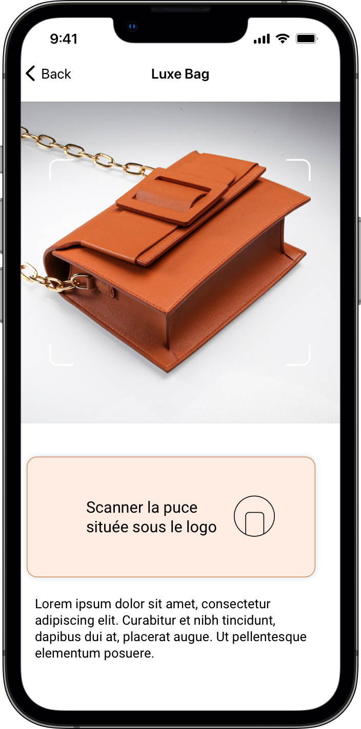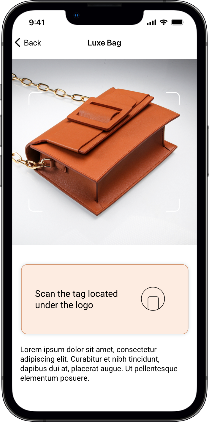 1. The owner of the bag scans the chip with his smartphone. Their COA appears. By scanning a second time for security reasons, they access all the authenticity information that the brand wishes to give, even the blockchain